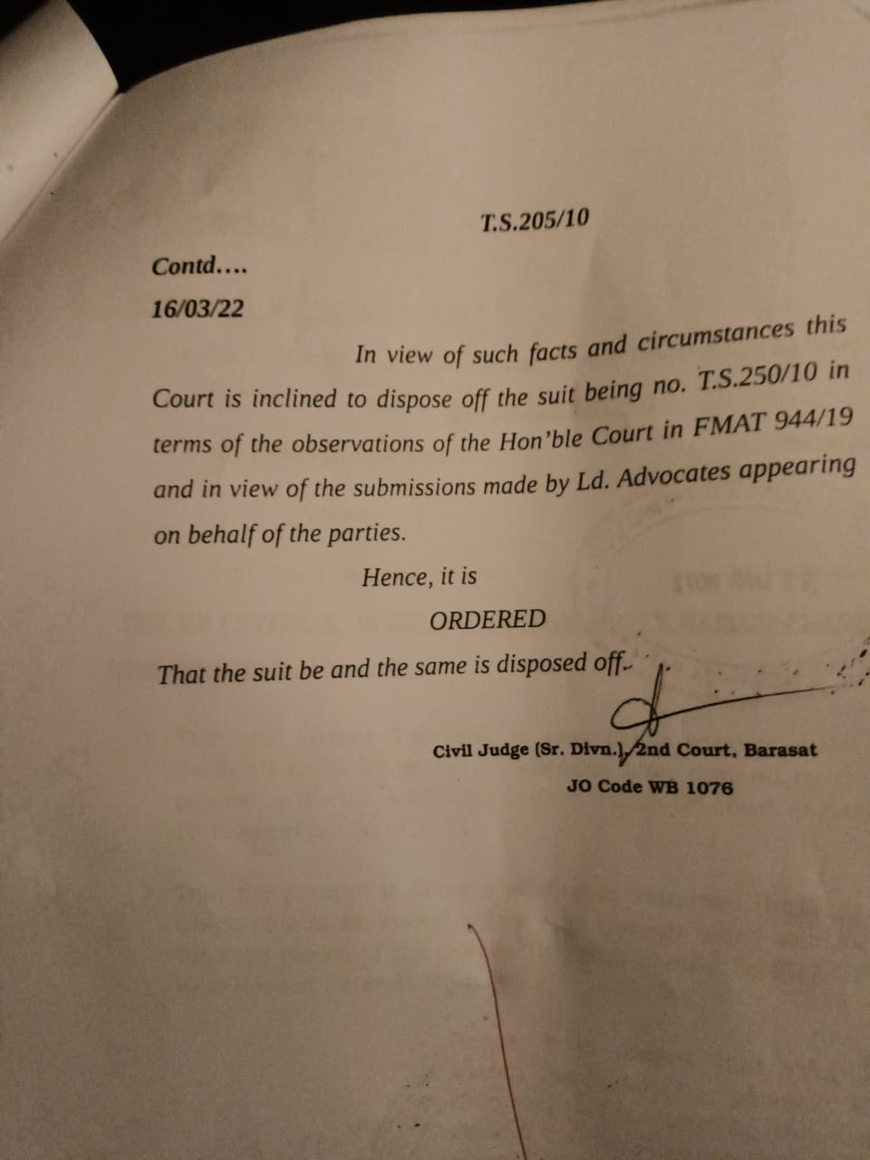 Barasat Court Order Dated 16.03.2022 - Disposing off suit - Page 1.jpeg