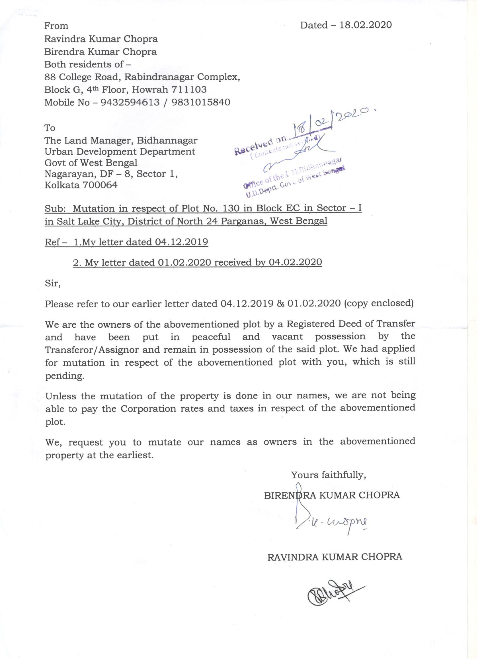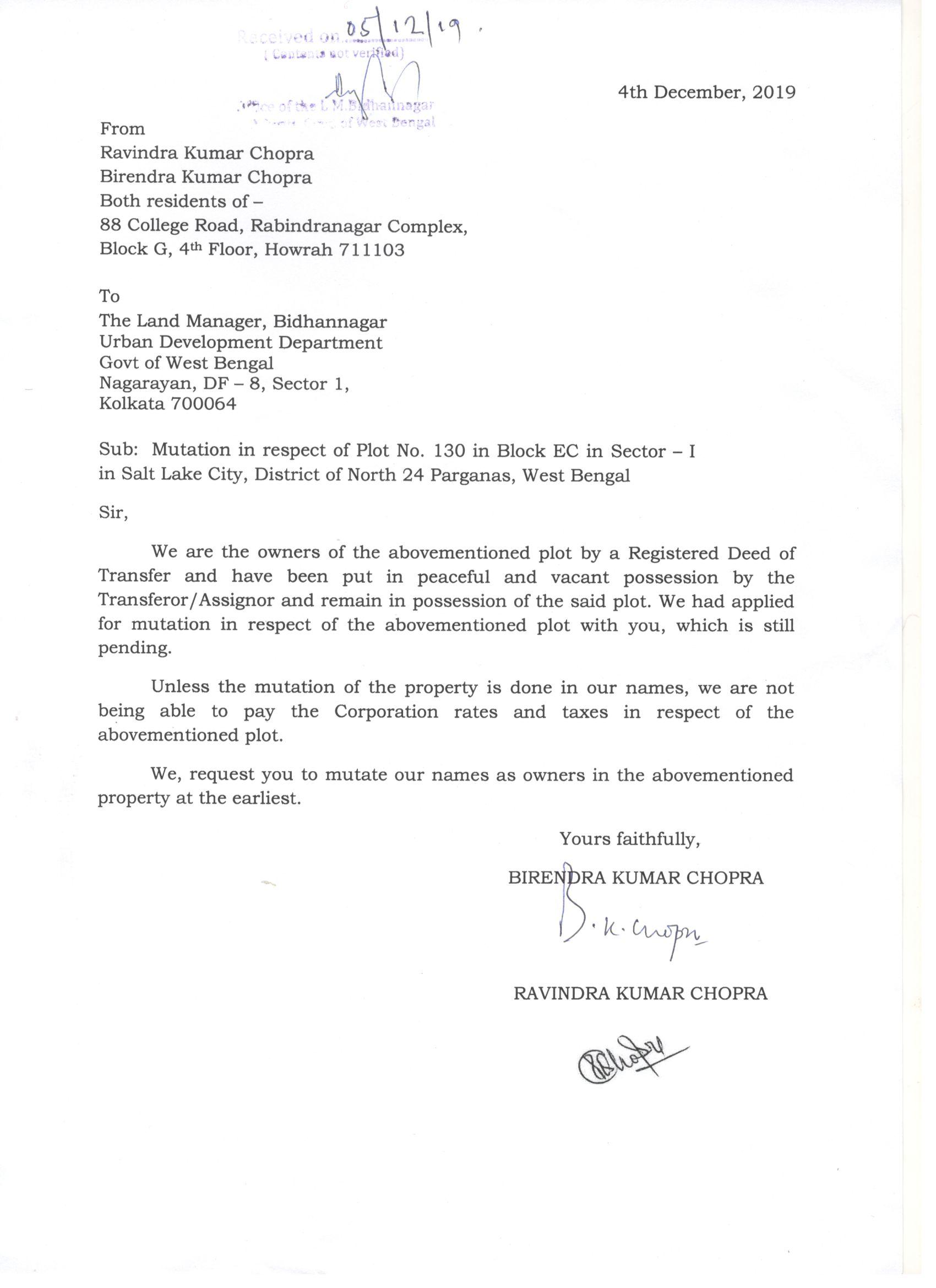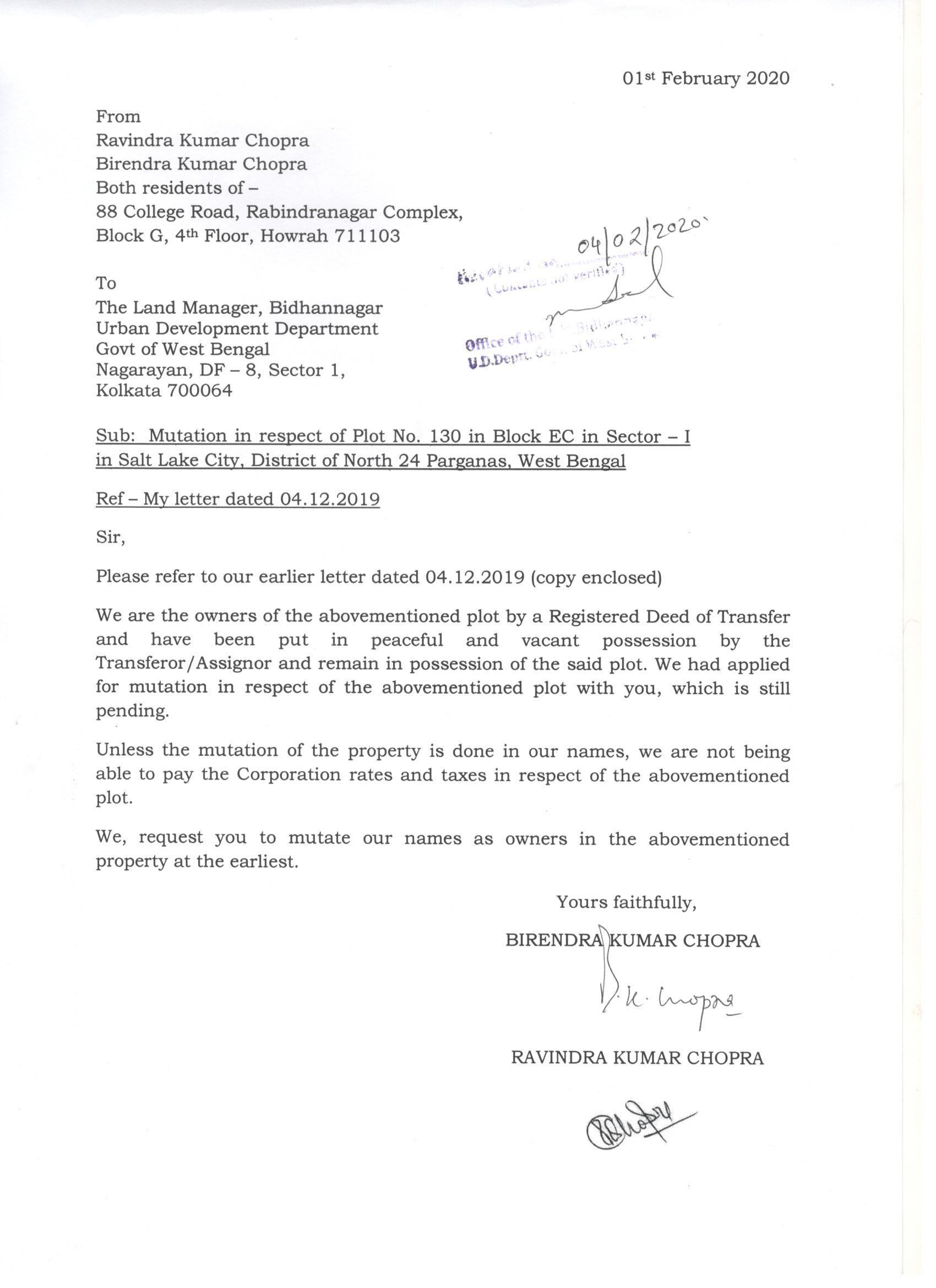 UD DEpt - MUTATION Request Letter - Dated 13.01.2021.docx